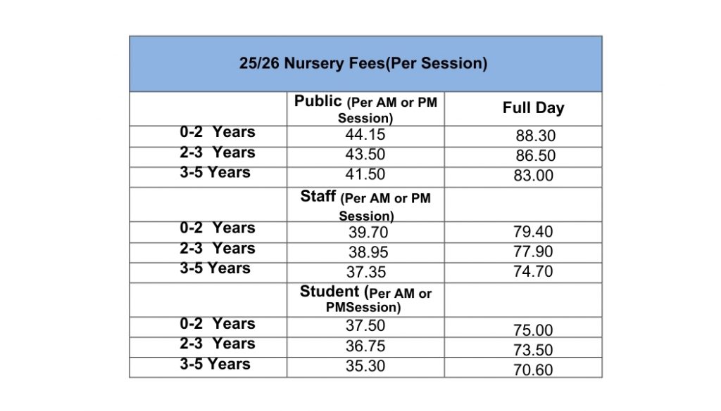 We have no top up/additional costs added on to session fees. We believe in removing barriers to accessing funded hours, so there are no hidden fees or unnecessary costs that you can expect in our invoice. All children can benefit from rich early educational experiences and government funded sessions can be used for any session, subject to availability. Nursery fees are reduced for students at Wivenhoe Park Day Nursery and are very competitive.